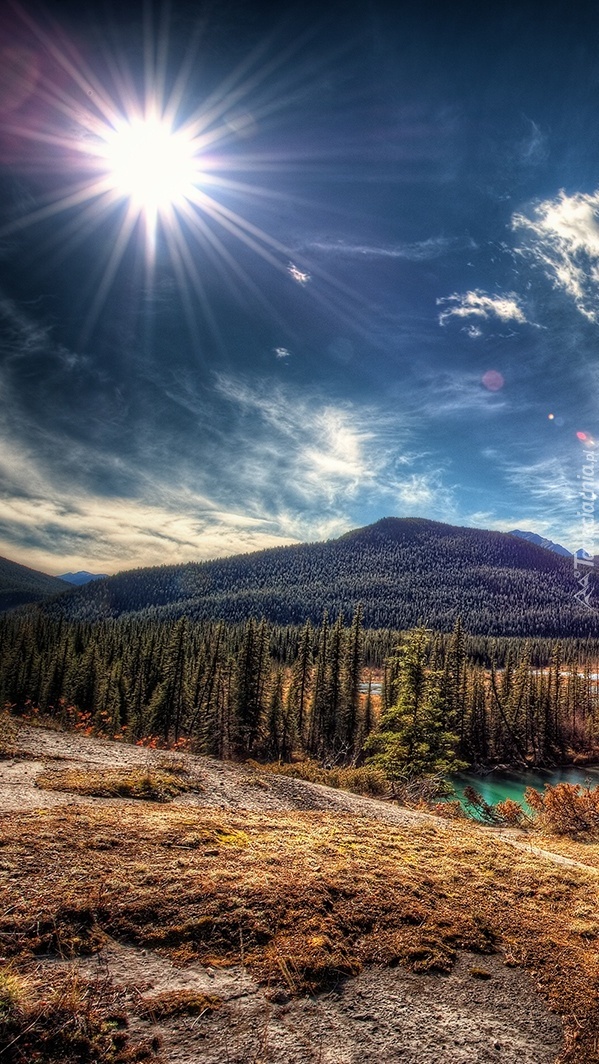 Edytor tapety: Słońce oświetla górską krainę