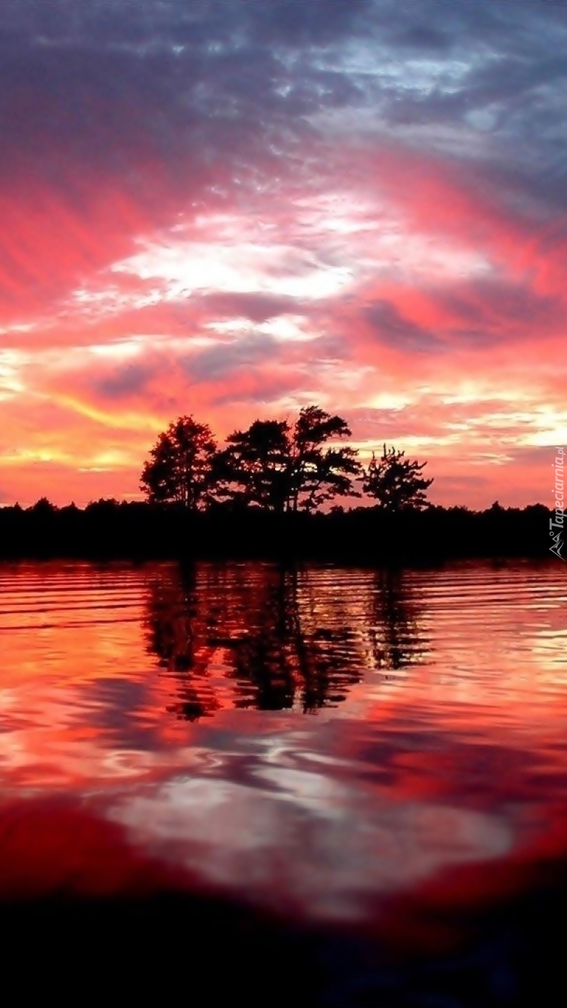 Edytor tapety: Drzewa nad jeziorem o zachodzie słońca