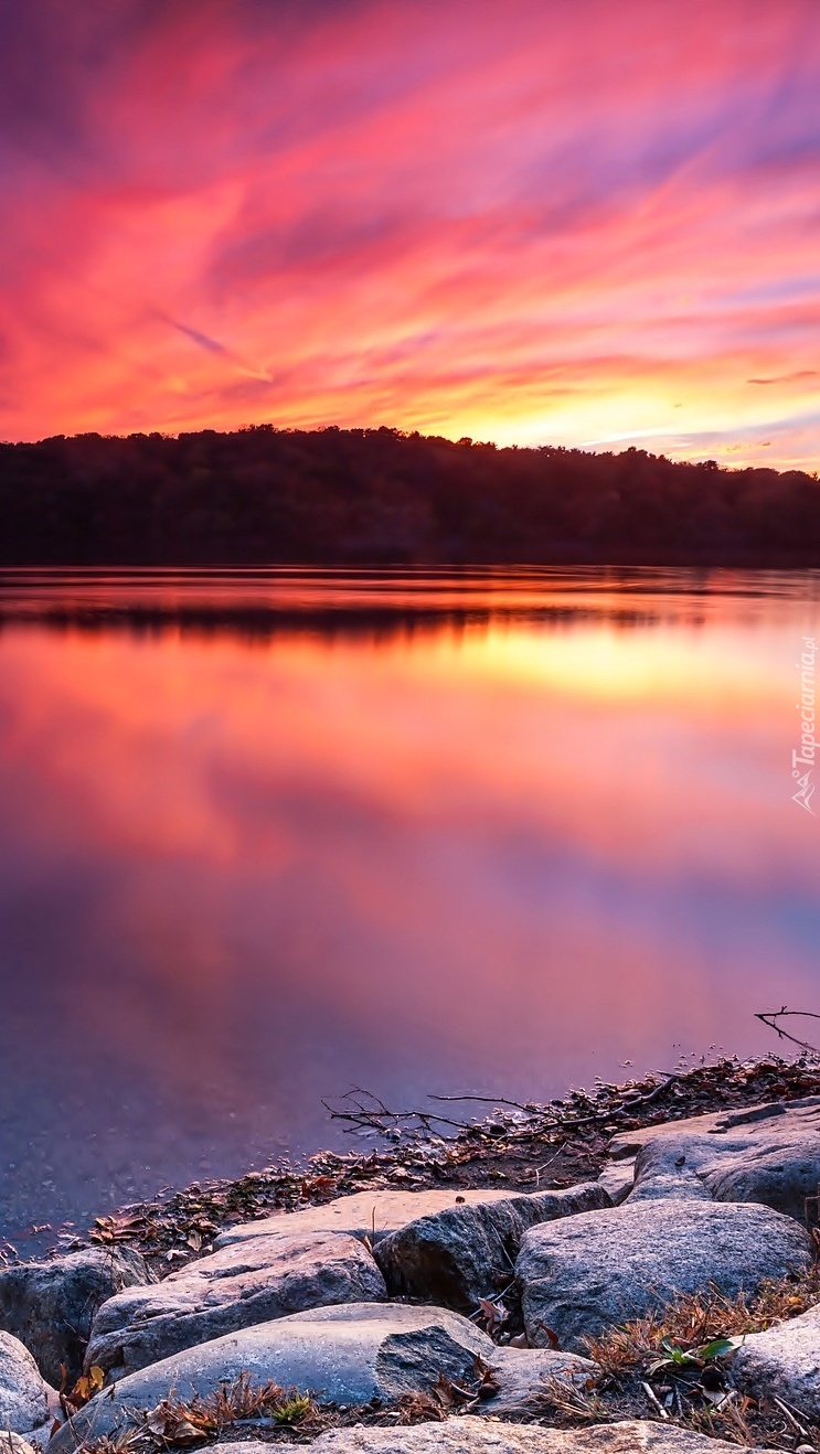 Edytor tapety: Kamienisty brzeg jeziora o zachodzie słońca
