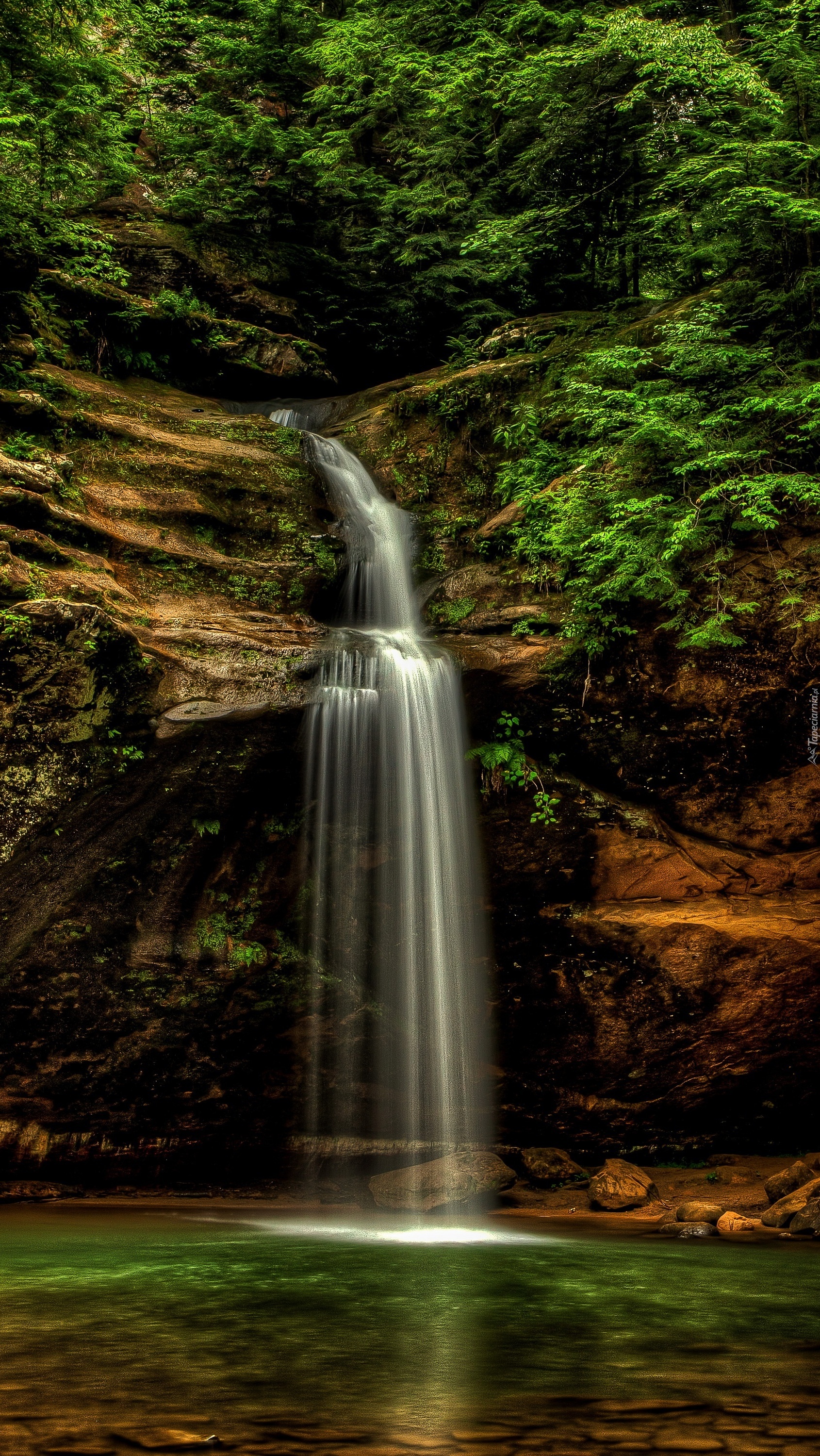 Edytor tapety: Wodospad spływa ze skały wśród drzew