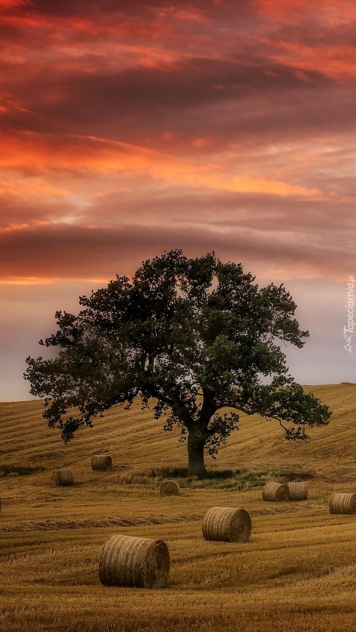 Edytor tapety: Drzewo na polu otoczone belami siana