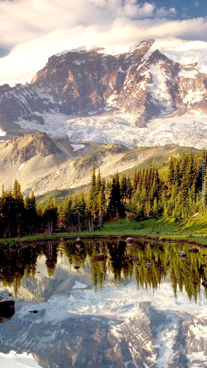 Edytor tapety: Jezioro otoczone lasem i górami