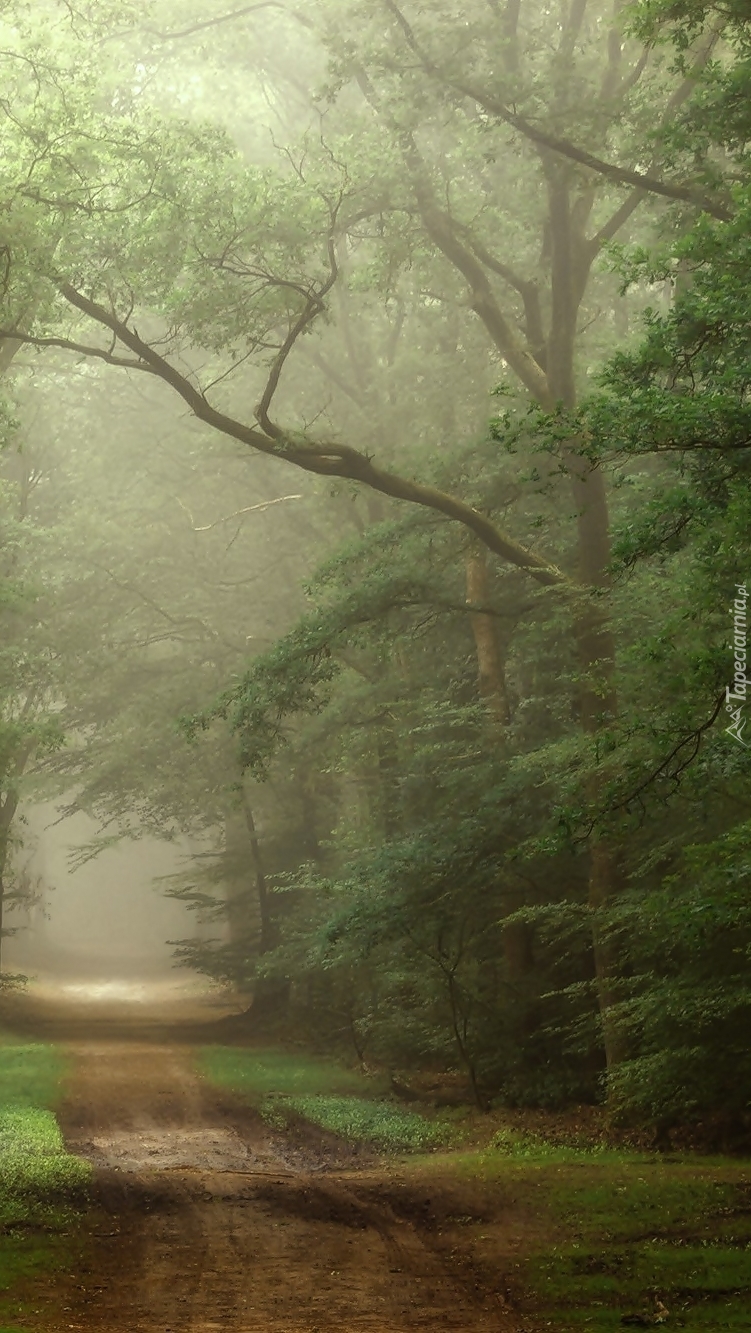 Edytor tapety: Droga w lesie osnuła się mgłą