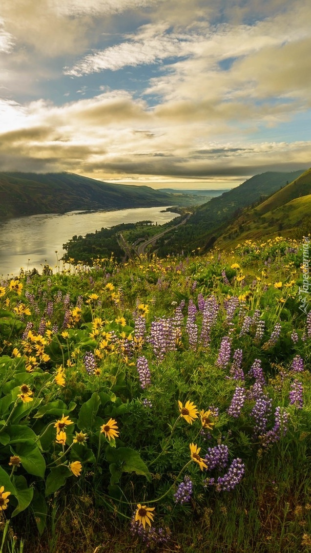 Edytor tapety: Porośnięte kwiatami wzgórze nad rzeką