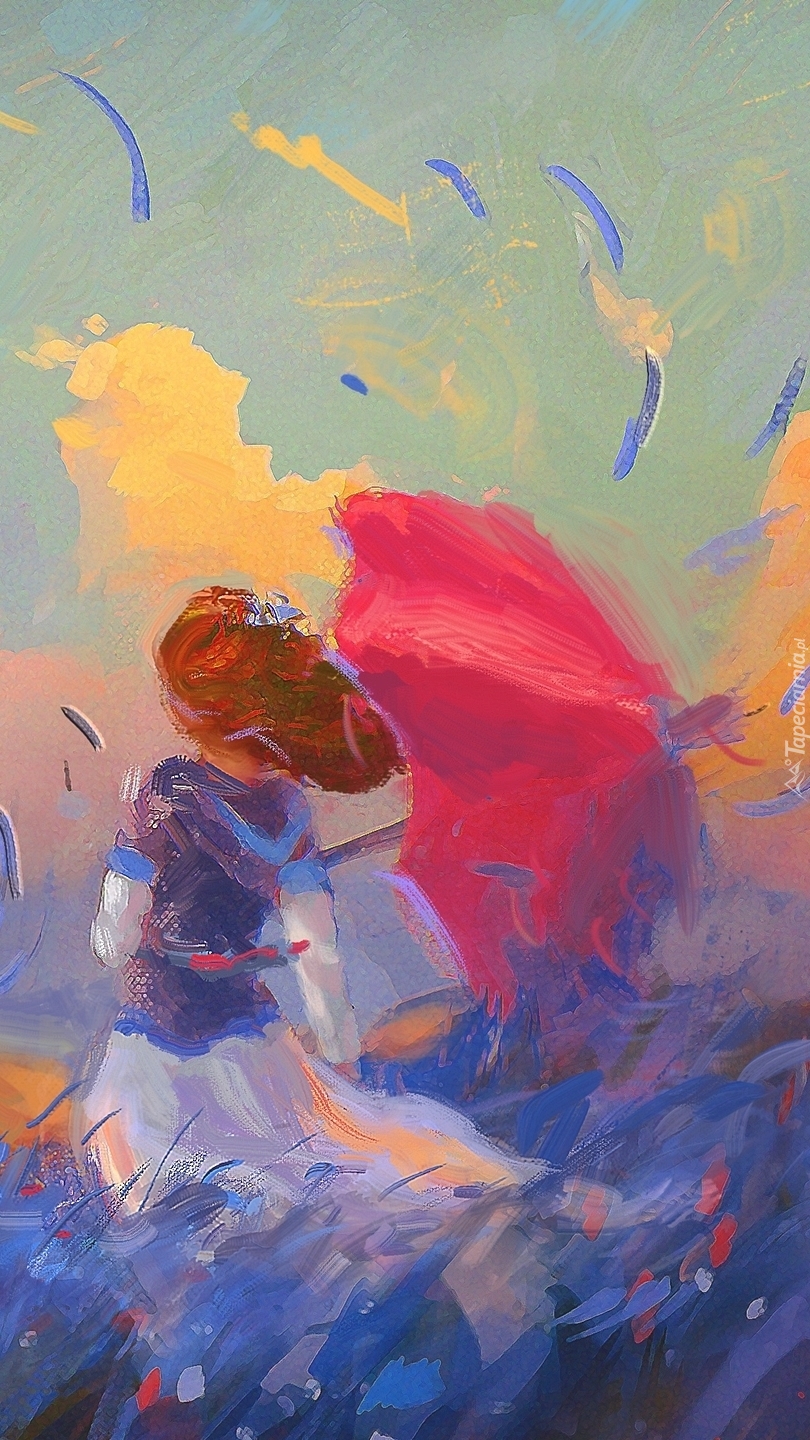 Edytor tapety: Dziewczyna z parasolką przy wietrznej pogodzie