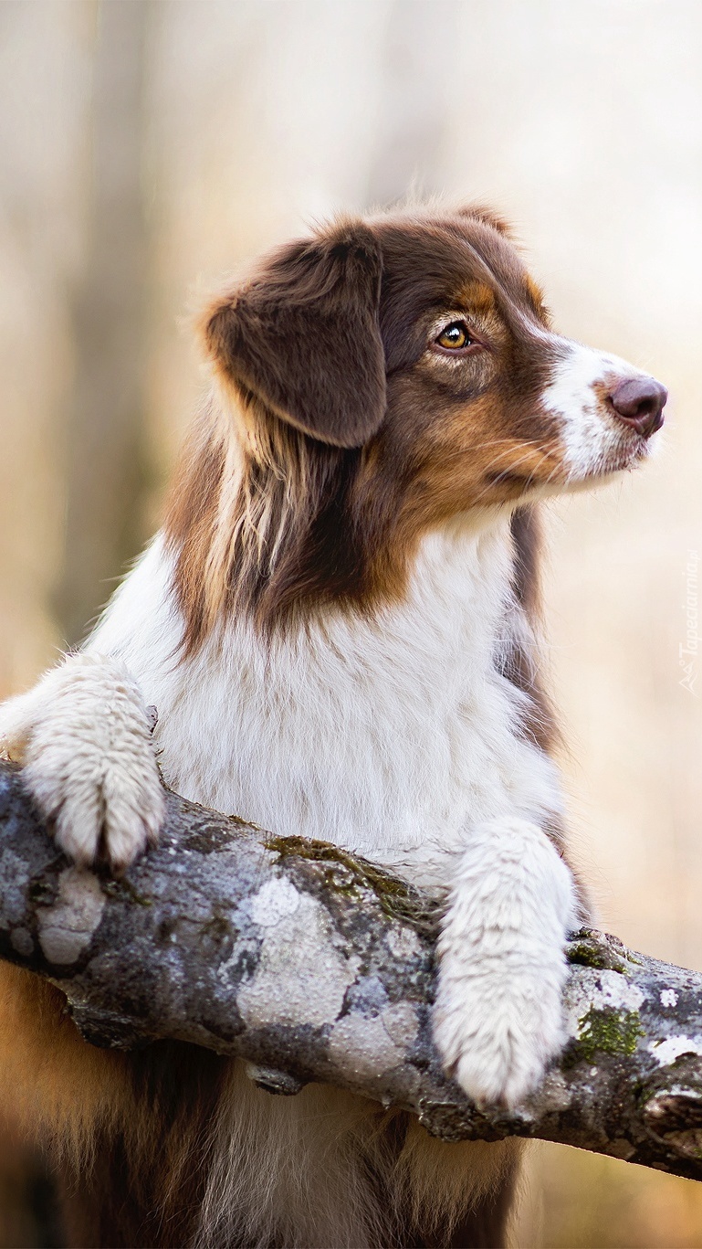 Edytor tapety: Owczarek australijski oparty o drzewo