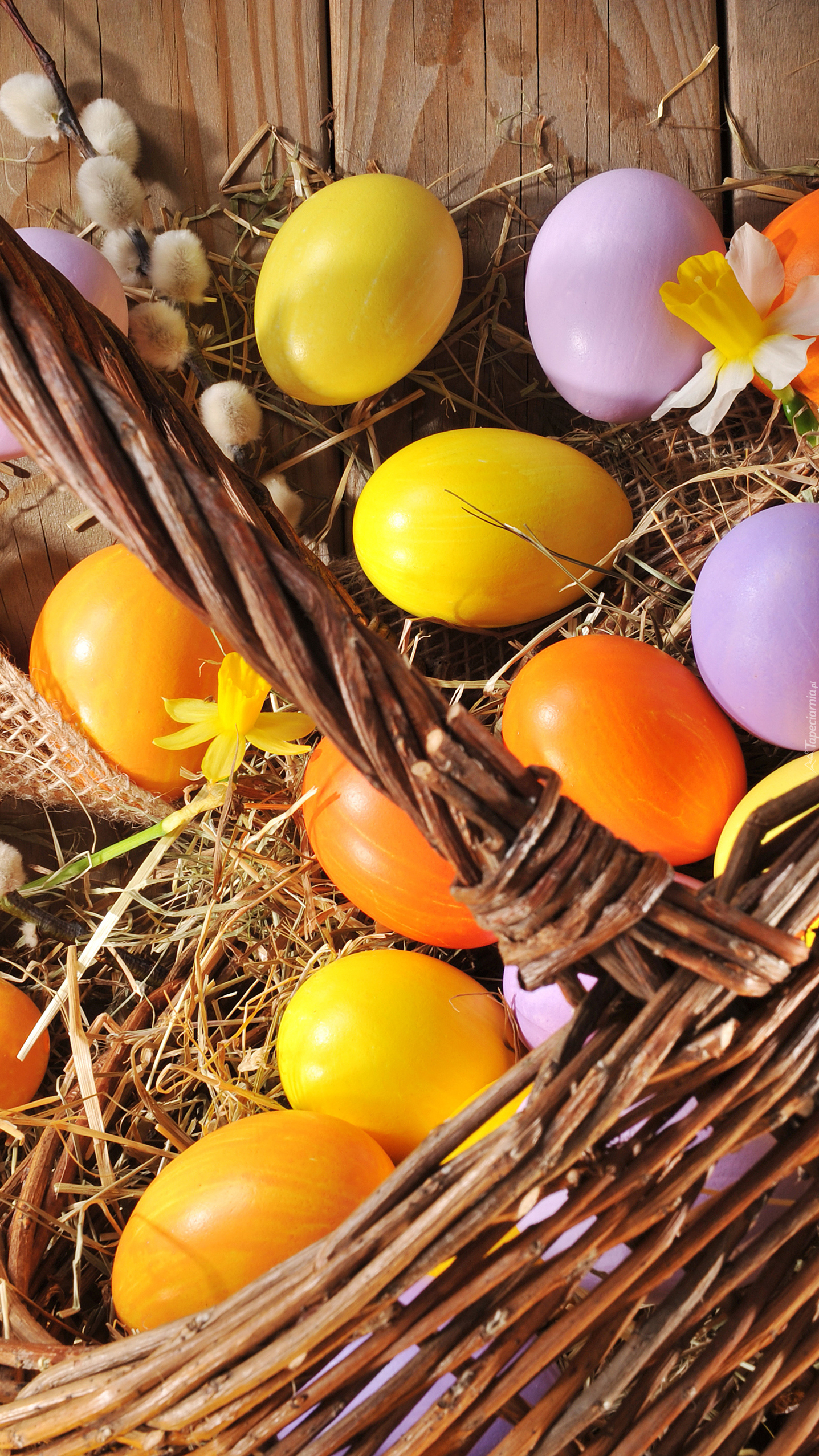 Edytor tapety: Pisanki i bazie w wiklinowym koszyku