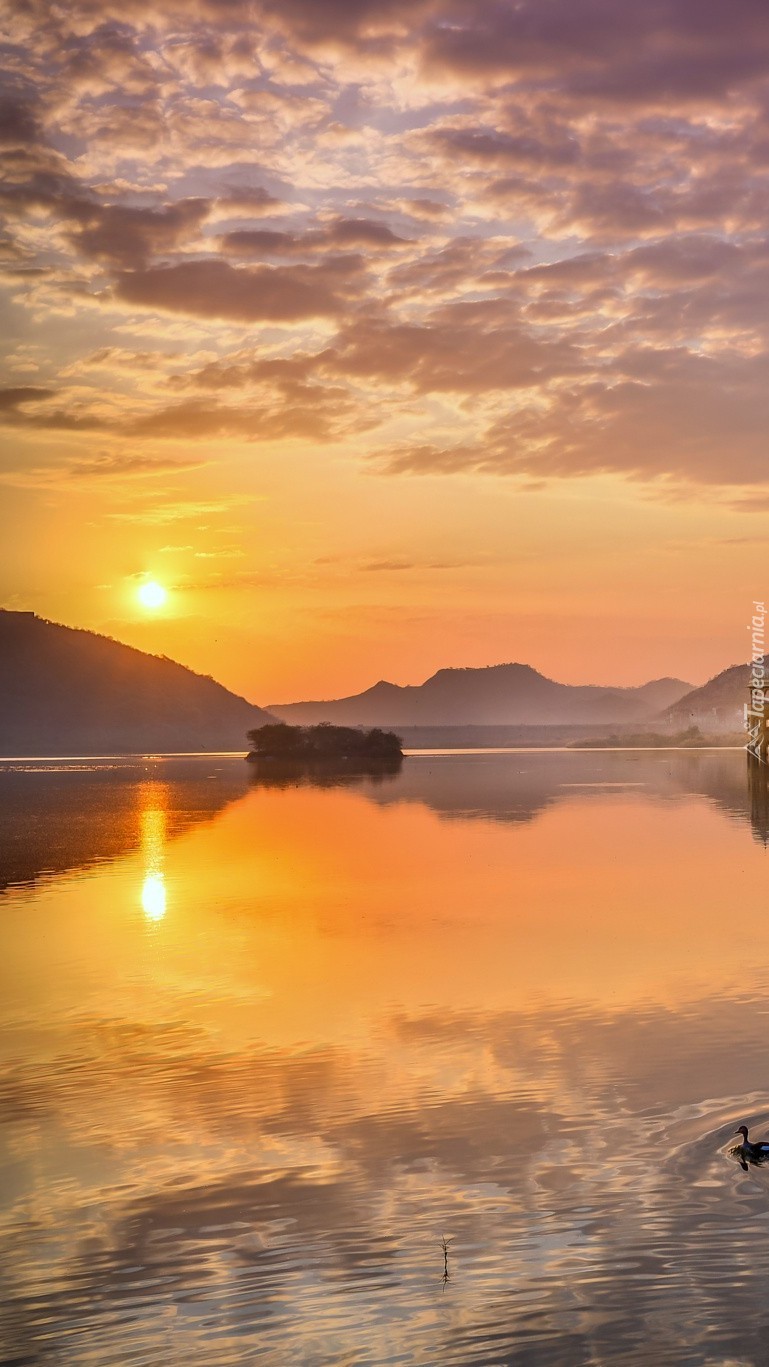 Edytor tapety: Słońce zachodzi nad spokojnym jeziorem