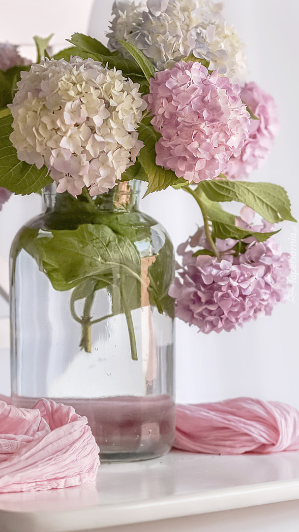 Edytor tapety: Szklany wazon z bukietem hortennsji