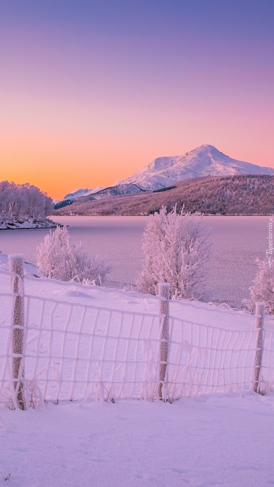 Edytor tapety: Oszronione drzewa nad jeziorem w górach