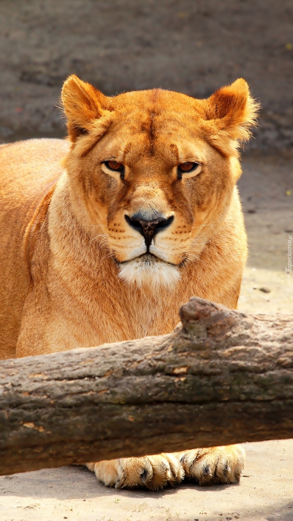 Edytor tapety: Lwica leży przy konarze