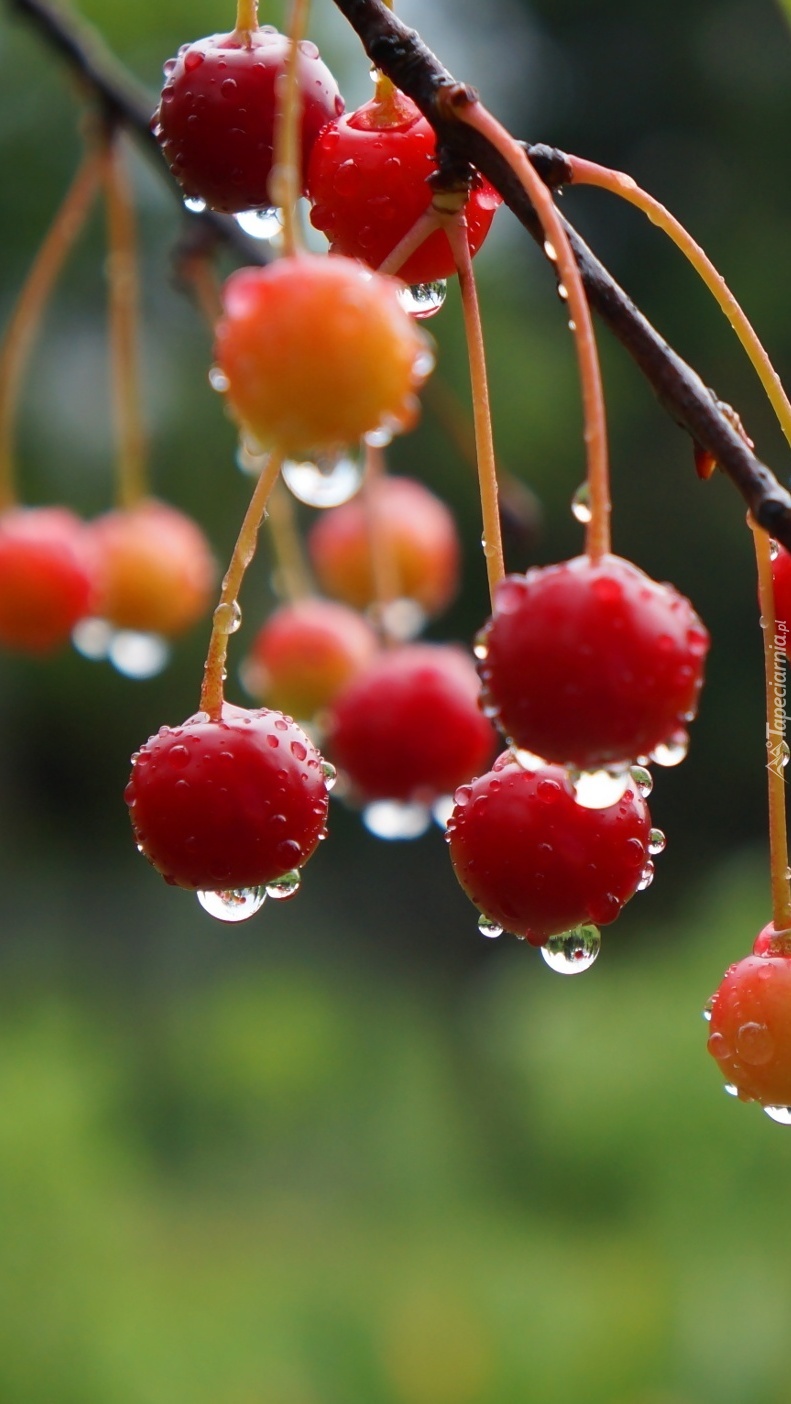 Edytor tapety: Wiśnie na gałązce w kroplach rosy