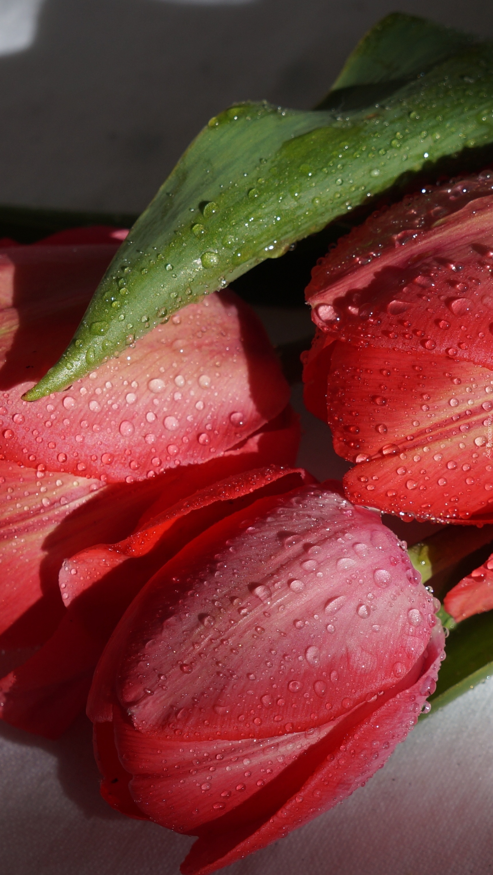 Edytor tapety: Krople wody na czerwonych tulipanach