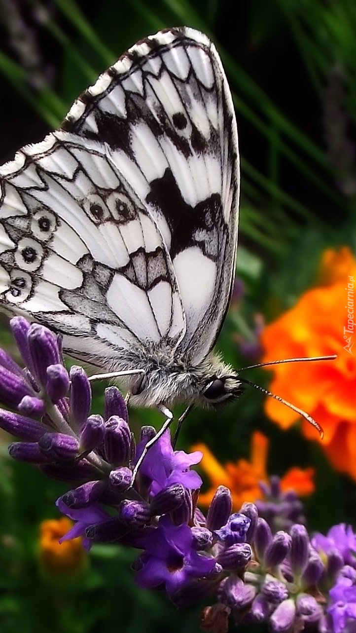 Edytor tapety: Biało-czarny motyl na lawendzie
