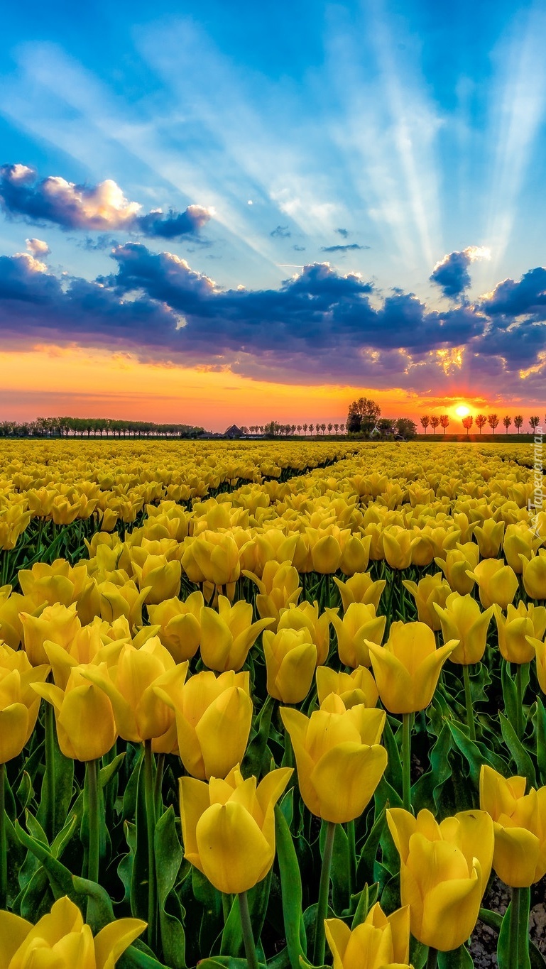 Edytor tapety: Plantacja żółtych tulipanów w promieniach słońca