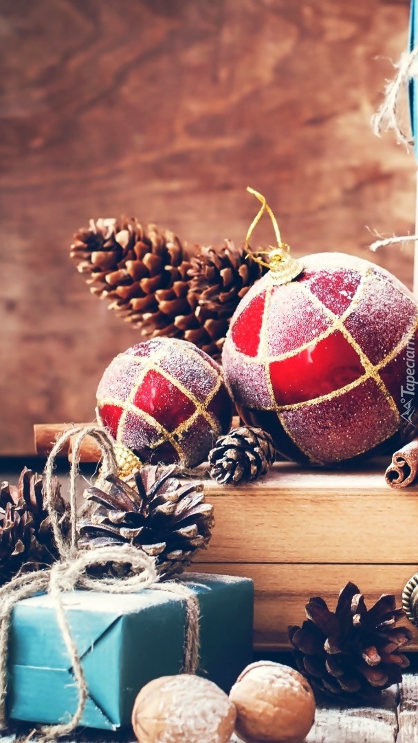 Edytor tapety: Bombki choinkowe obok szyszek i prezentu