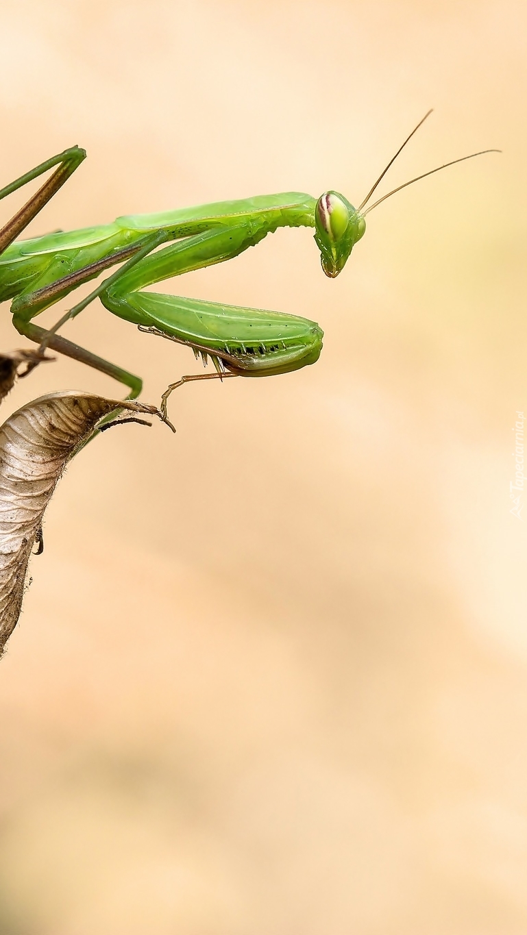 Edytor tapety: Zielona modliszka na suchej roślinie