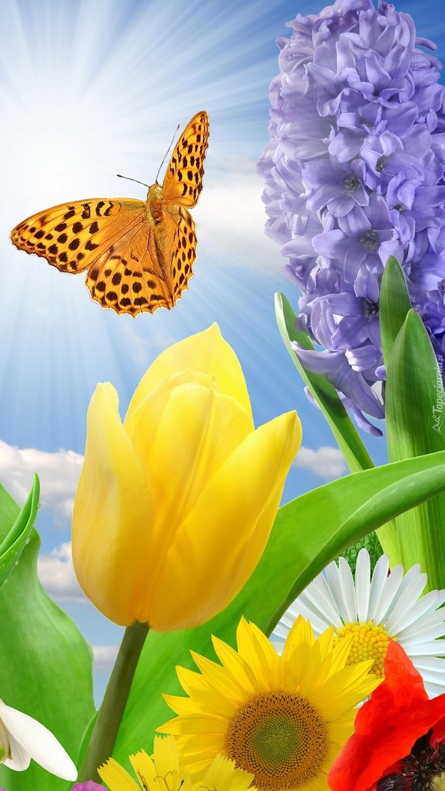 Edytor tapety: Wiosenna grafika z kwiatami i motylem