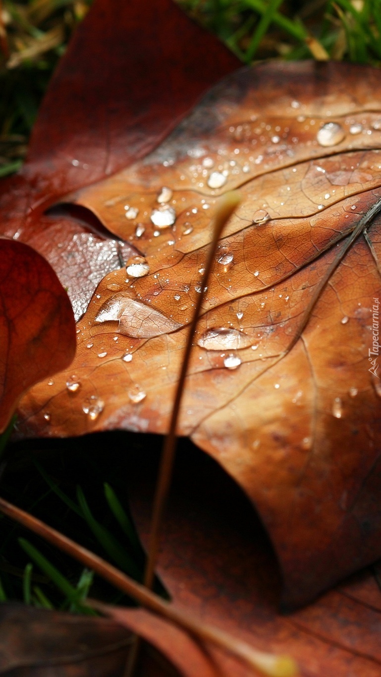 Edytor tapety: Krople wody na brązowych jesiennych liściach