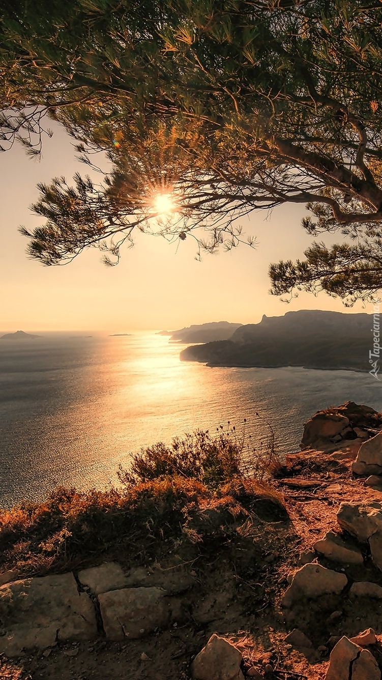 Edytor tapety: Słońce w gałęziach drzew nad morzem