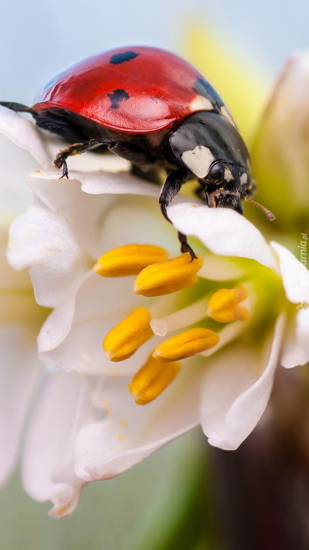 Edytor tapety: Biedronka chodząca po białym kwiatku