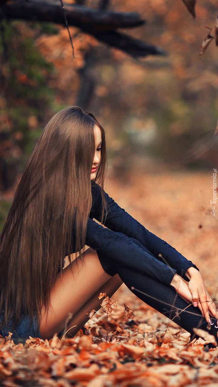 Edytor tapety: Długowłosa piękność siedząca na liściach