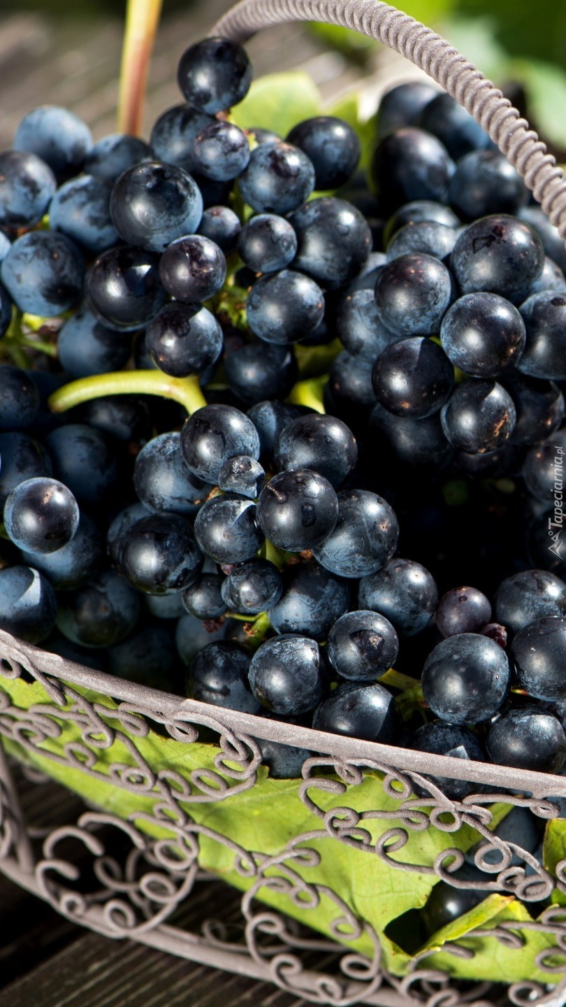 Edytor tapety: Czarne winogrona w metalowym koszyku