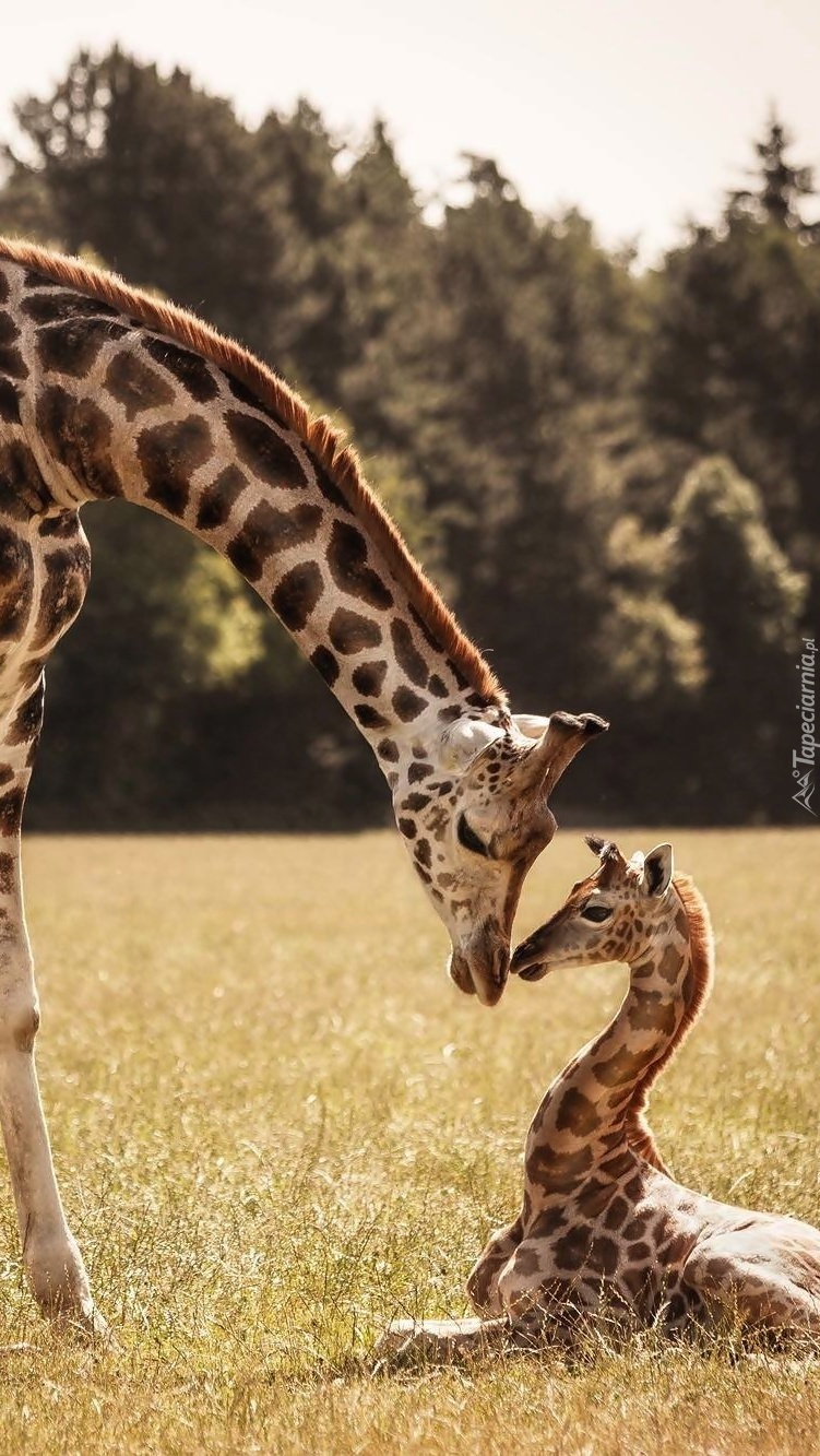 Edytor tapety: Mała żyrafa z mamą na polanie
