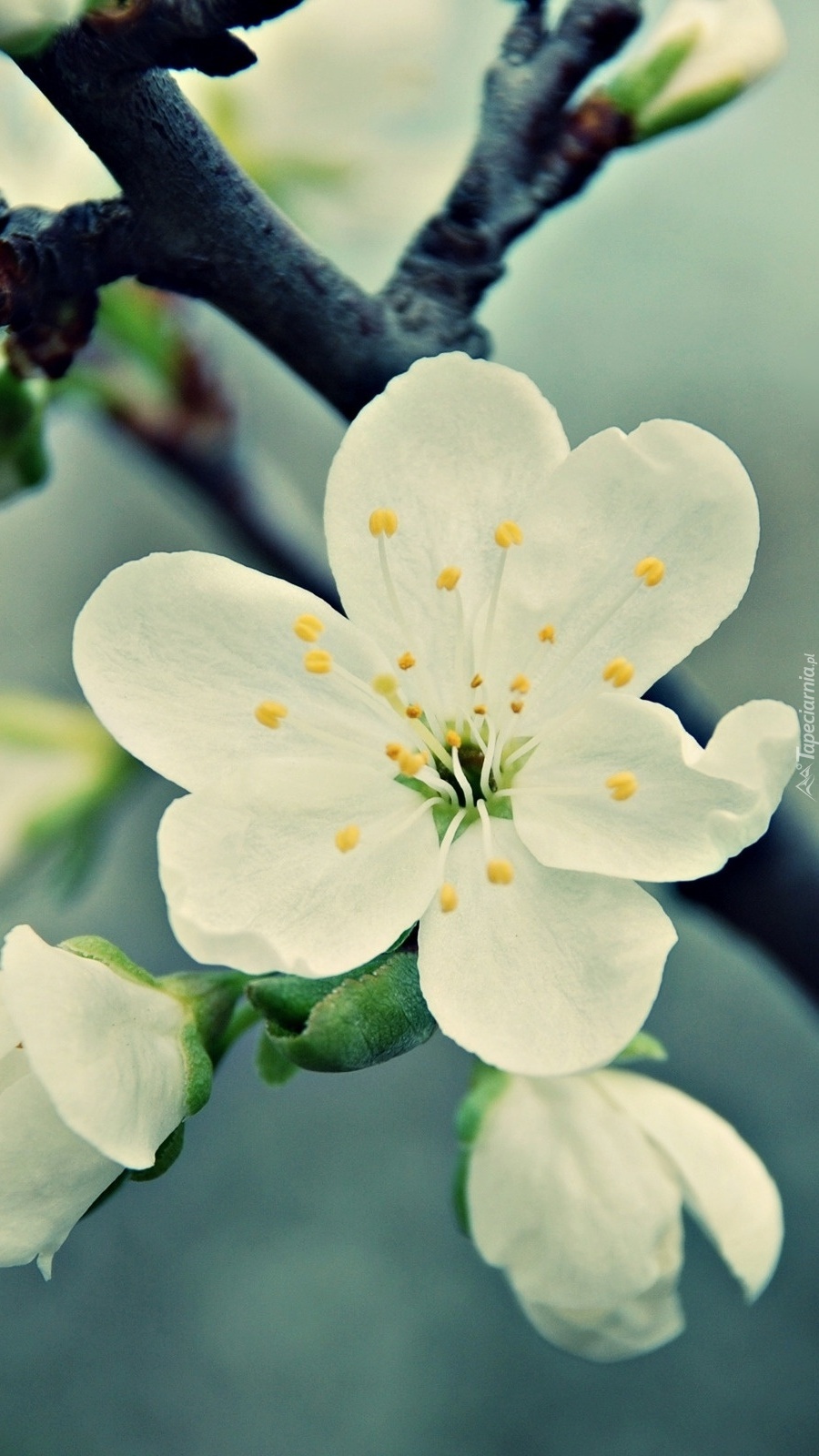 Edytor tapety: Białe kwiaty na gałęzi drzewa owocowego