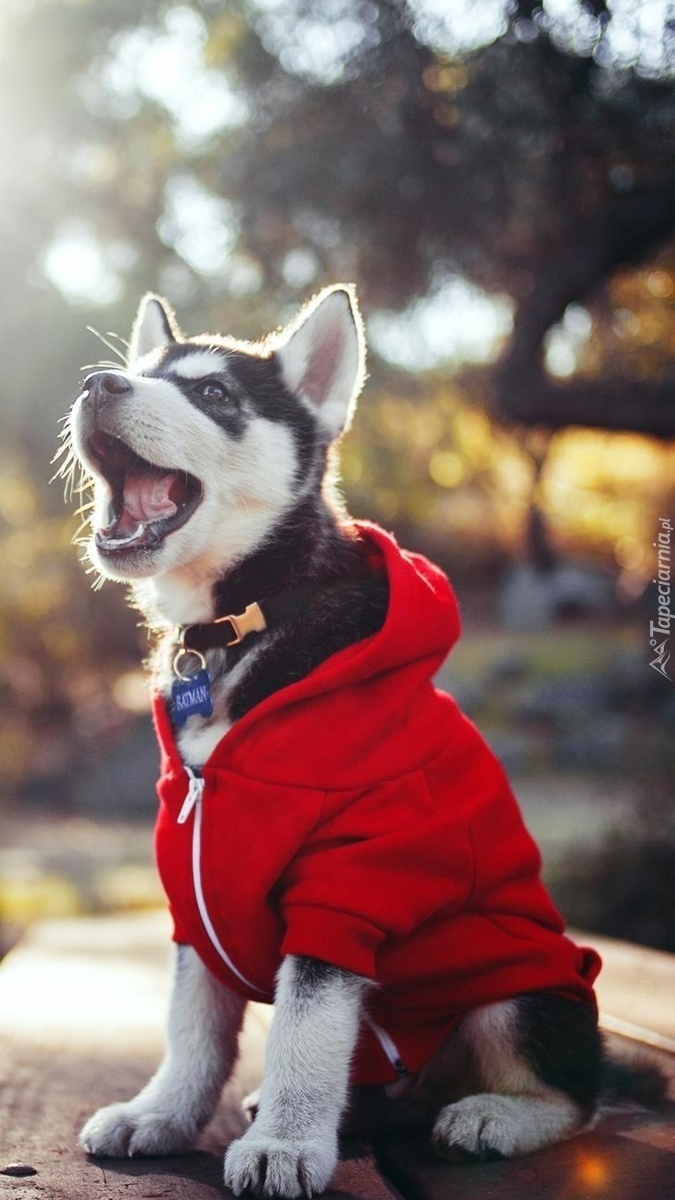Edytor tapety: Husky w czerwonej bluzie z kapturem