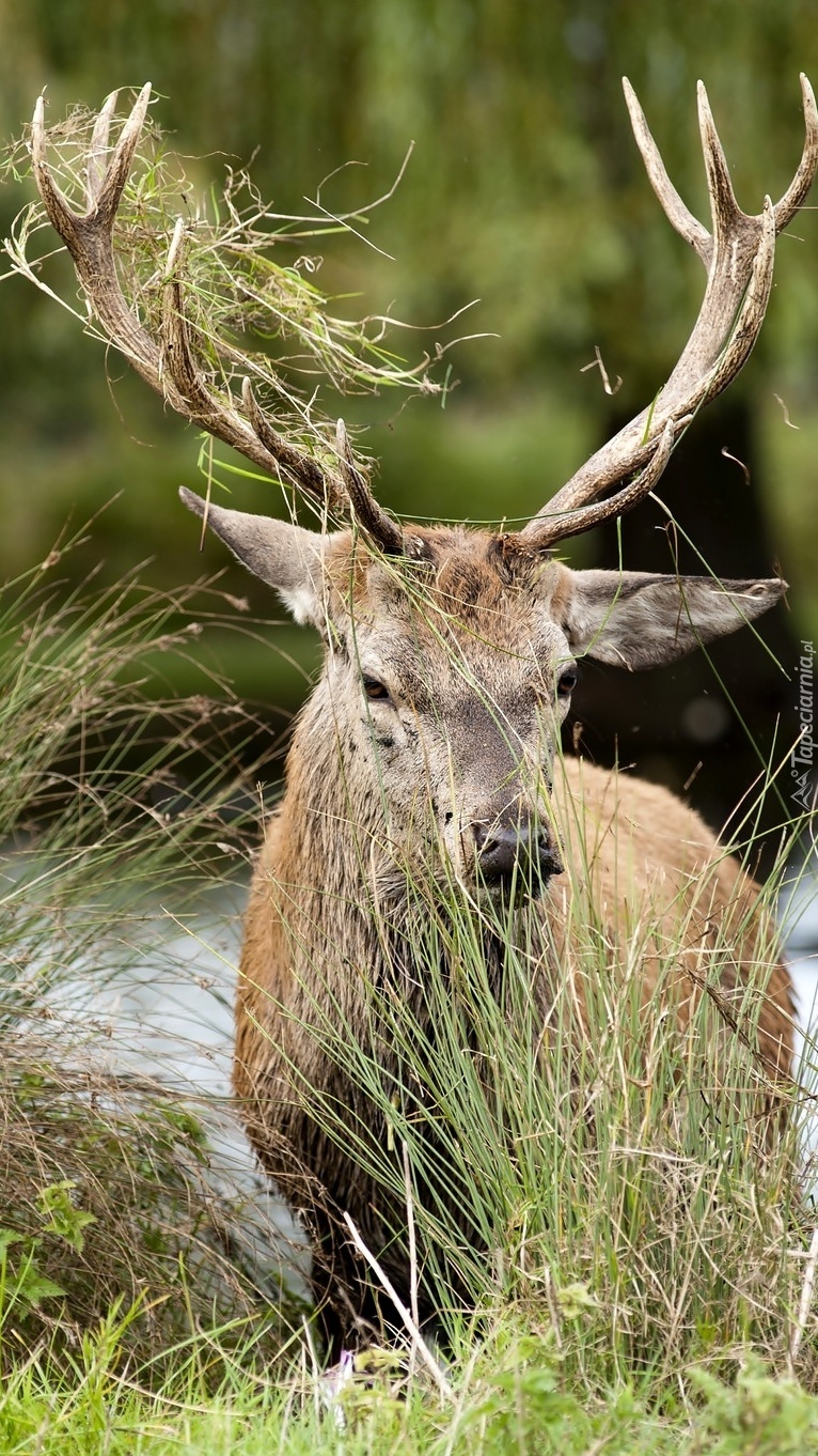 Edytor tapety: W trawie nad rzeką stoi jeleń