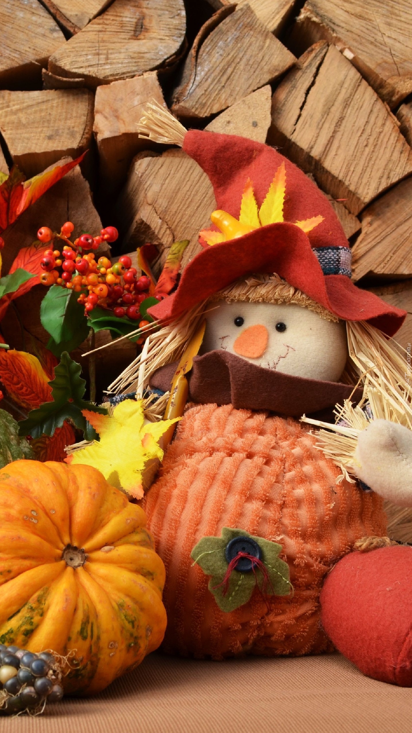 Edytor tapety: Jesienna laleczka przy stosie drewnna