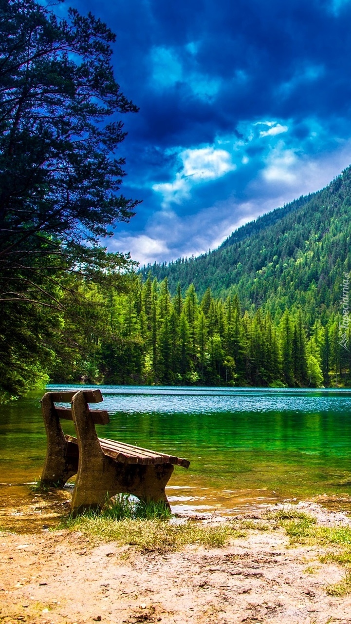 Edytor tapety: Ławeczka nad jeziorem w górach