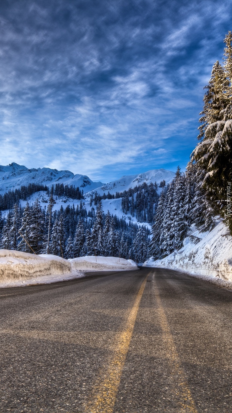Edytor tapety: Asfaltowa zimowa droga górskich lasach