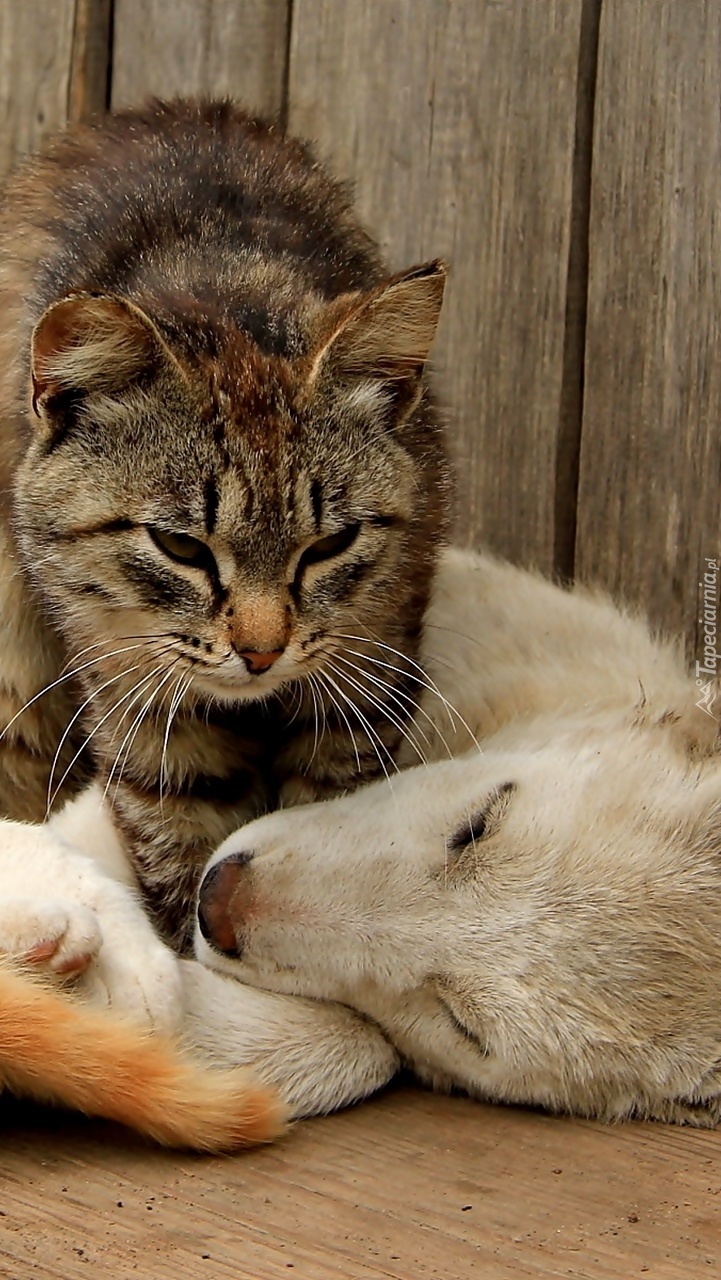 Edytor tapety: Szarobury kot łażący po psie