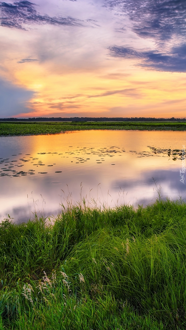 Edytor tapety: Jezioro z trawami o zachodzie słońca