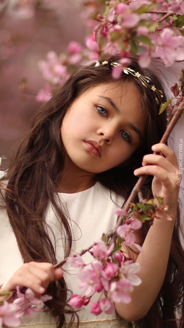 Edytor tapety: Smutne dziewczątko z kwitnącą gałązką