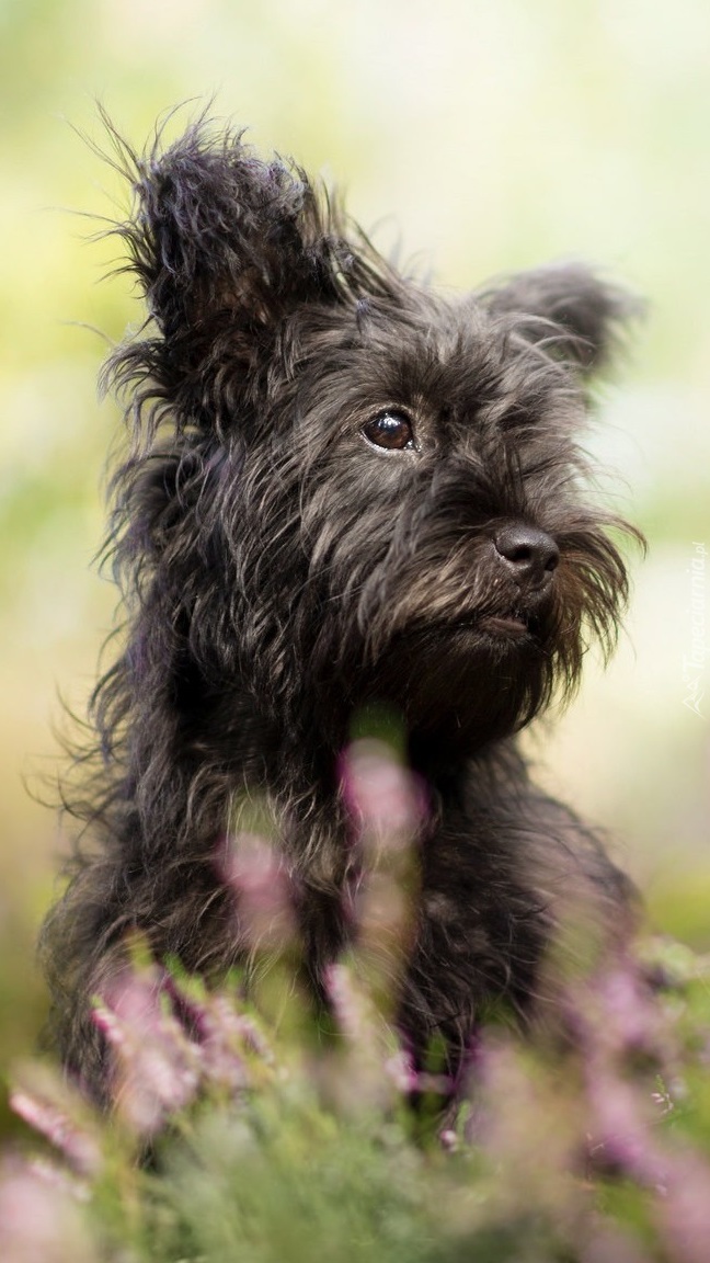 Edytor tapety: Kudłaty czarny pies pośród wrzosów