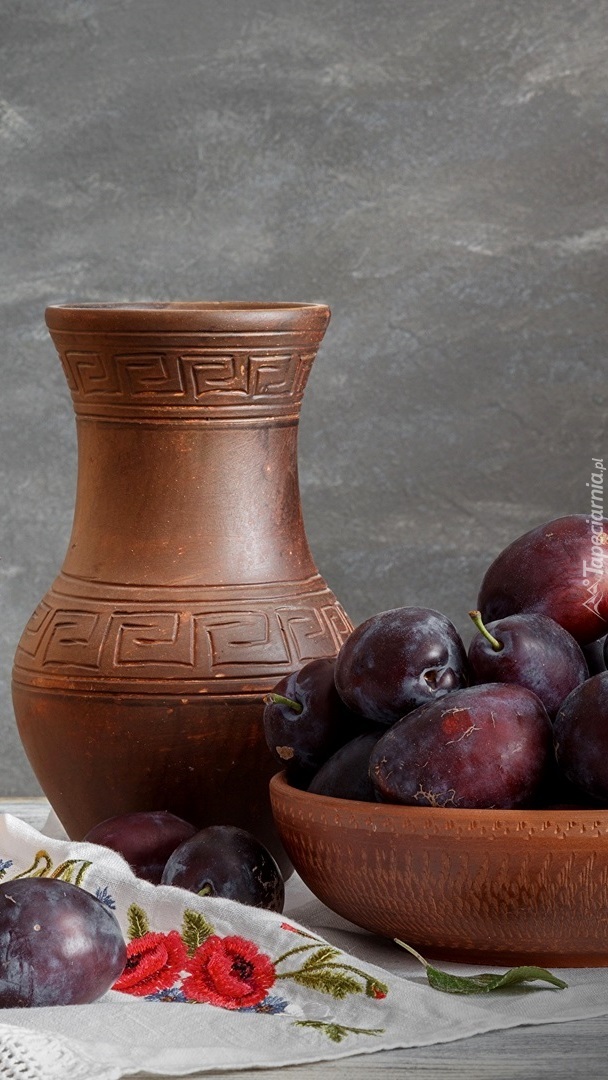 Edytor tapety: Miska śliwek obok wazonu