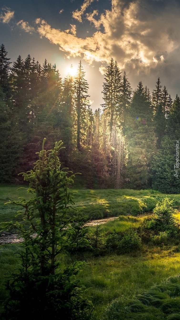 Edytor tapety: Wschód słońca nad leśną rzeką