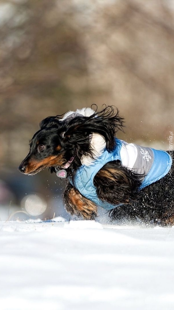 Edytor tapety: Jamnik biegnie po śniegu