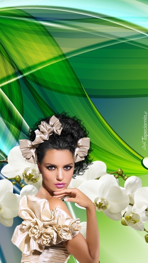 Edytor tapety: Kobieta ze storczykami na zielonym tle