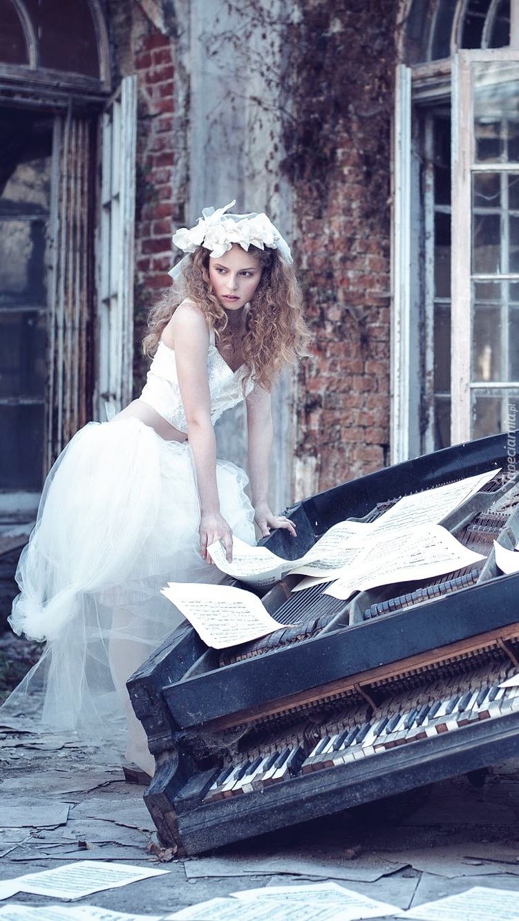 Edytor tapety: Kobieta przy zniszczonym fortepianie