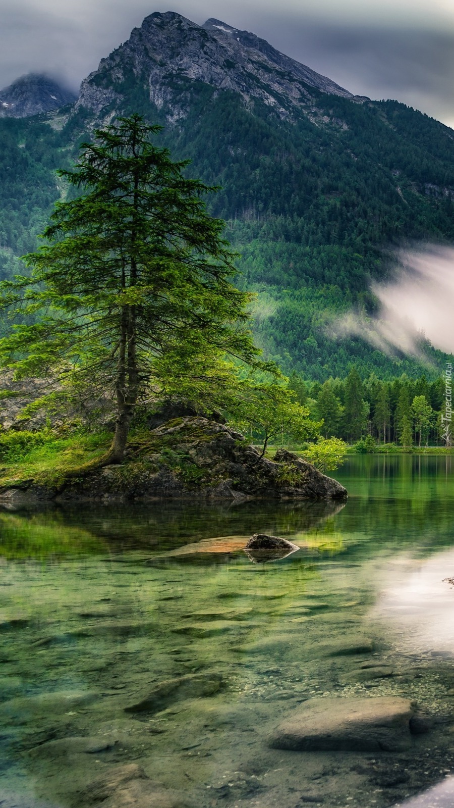 Edytor tapety: Drzewo na brzegu górskiego jeziora