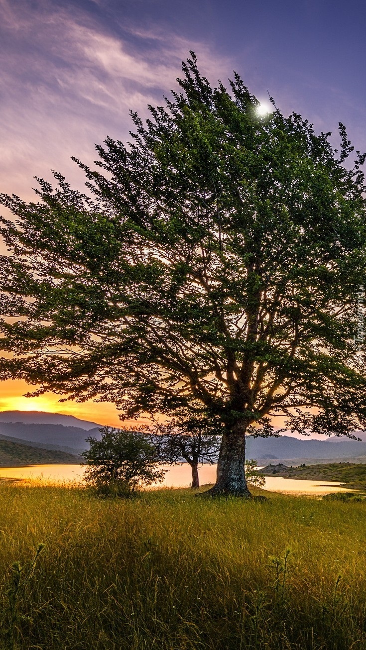 Edytor tapety: Drzewo na polu niedaleko jeziora