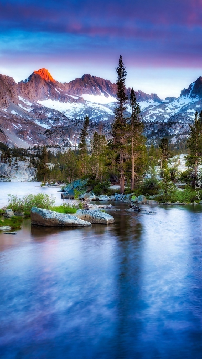 Edytor tapety: Śnieg leżący w górach nad rzeką