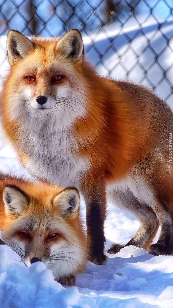 Edytor tapety: Rude liski w klatce na śniegu