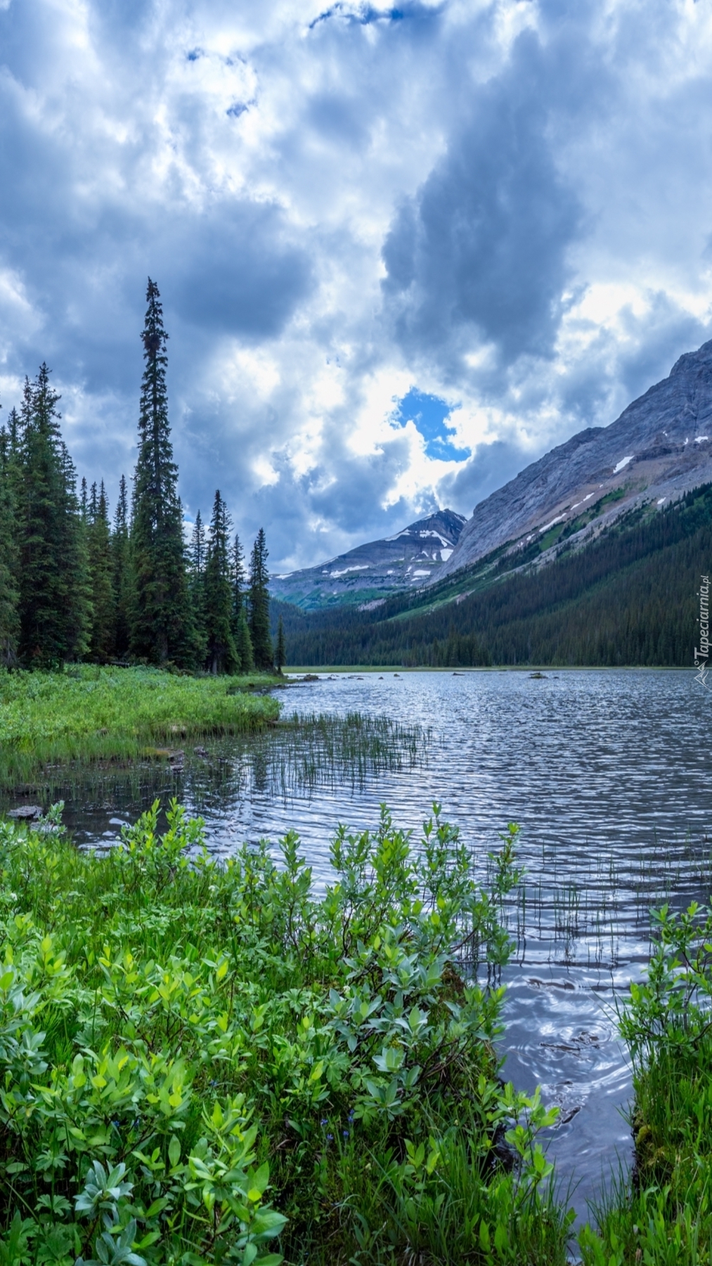Edytor tapety: Chmury nad górami lasami i jeziorem