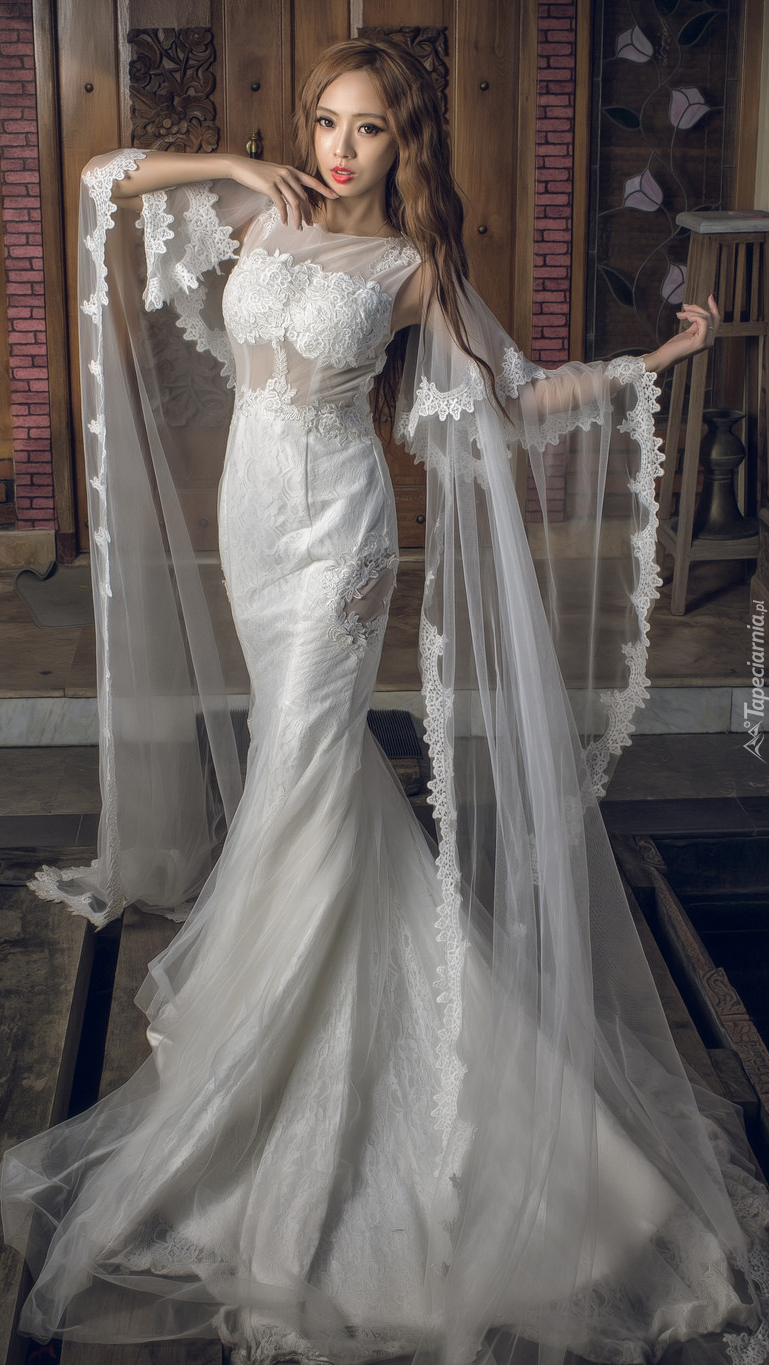 Edytor tapety: Azjatka w białej stylowej długiej sukni
