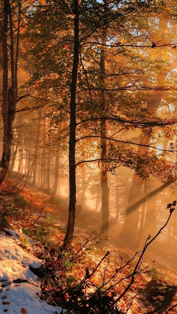 Edytor tapety: Zamglony las przyprószony śniegiem